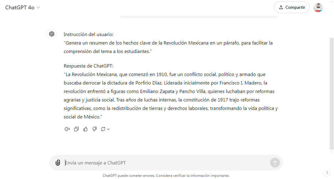 Ejemplo: En una clase de historia, ChatGPT puede generar preguntas sobre la Revolución Mexicana o resumir los hechos clave, lo que facilita la comprensión del tema para los estudiantes.