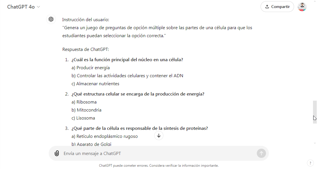 - Juegos educativos: Los docentes pueden usar ChatGPT para crear trivias, juegos de preguntas y respuestas o desafíos interactivos. Esto es ideal para revisar contenidos de forma divertida. Ejemplo: En una clase de biología, ChatGPT puede generar un juego de preguntas sobre las partes de una célula, donde los estudiantes deben seleccionar la opción correcta.