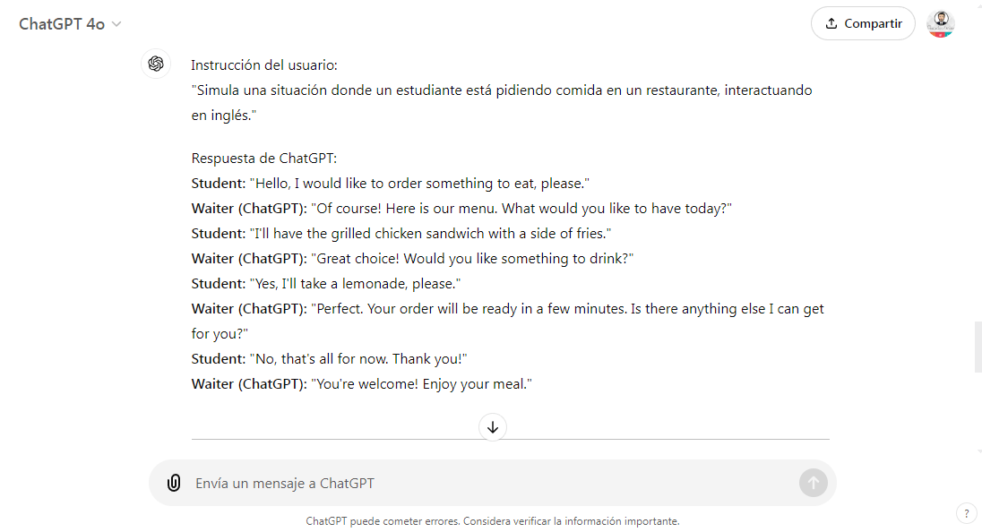 - Simulación de conversaciones: Para clases de idiomas, ChatGPT puede actuar como un interlocutor en conversaciones simuladas, ayudando a los estudiantes a practicar habilidades de comunicación. Ejemplo: En una clase de inglés, los estudiantes pueden interactuar con ChatGPT simulando situaciones como pedir en un restaurante o tener una entrevista de trabajo.