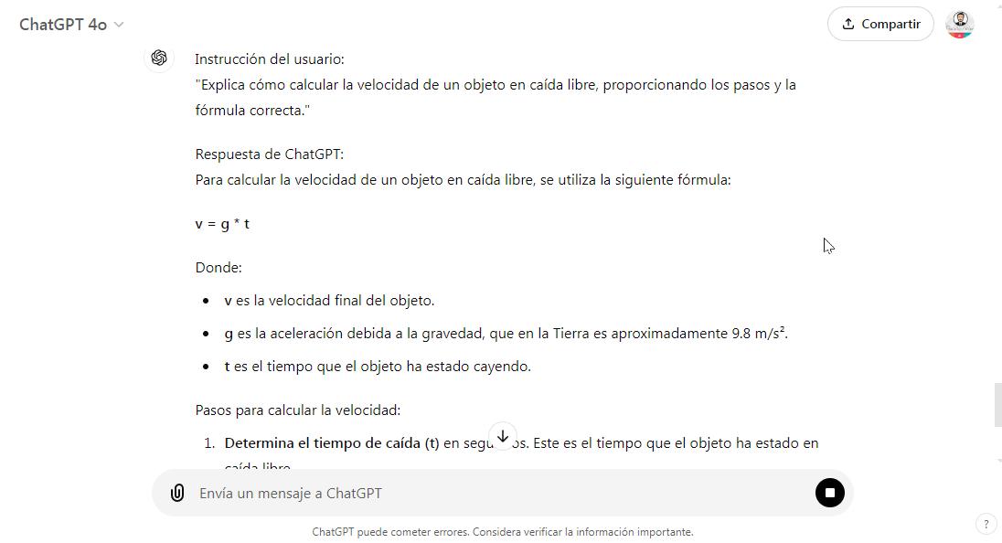 - Simulaciones en ciencias: ChatGPT puede guiar a los estudiantes a través de simulaciones de procesos científicos, facilitando la comprensión de conceptos complejos. Ejemplo: En una clase de física, ChatGPT puede explicar cómo calcular la velocidad de un objeto en caída libre, proporcionando los pasos para aplicar la fórmula correcta.