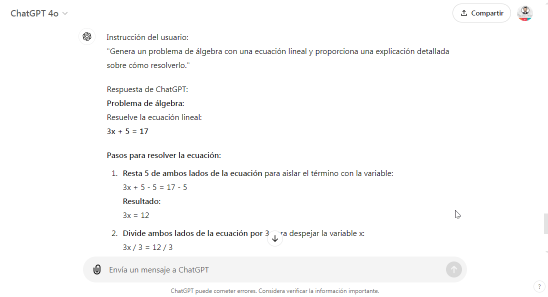 - Resolución de problemas matemáticos: ChatGPT puede plantear problemas de matemáticas y guiar a los estudiantes paso a paso para que comprendan la metodología de resolución. Ejemplo: ChatGPT puede generar problemas de álgebra y proporcionar explicaciones detalladas sobre cómo resolver ecuaciones lineales, ayudando a los estudiantes a practicar y mejorar.