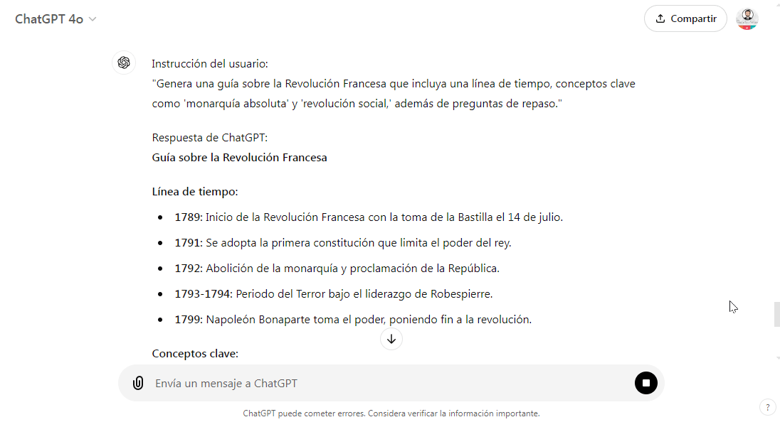 - Ejemplo (Historia): Para una clase de historia sobre la Revolución Francesa, ChatGPT puede generar una guía que incluya una línea de tiempo, conceptos clave como “monarquía absoluta” y “revolución social,” además de preguntas de repaso.
