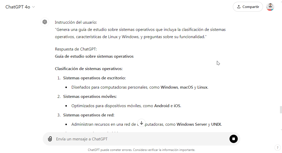 - Ejemplo (Informática): En un curso de informática, ChatGPT puede crear una guía de estudio sobre sistemas operativos que incluya la clasificación de sistemas operativos, características de Linux y Windows, y preguntas sobre su funcionalidad.