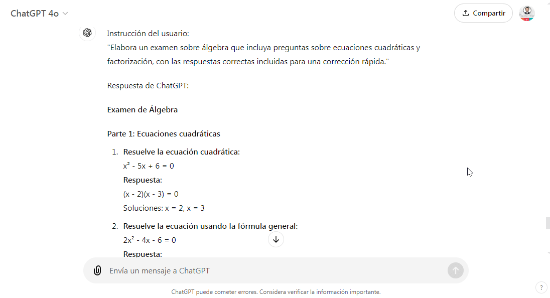 - Ejemplo (Matemáticas): Un docente puede pedir a ChatGPT que elabore un examen sobre álgebra, incluyendo preguntas sobre ecuaciones cuadráticas y factorización, con respuestas correctas incluidas para una corrección rápida.