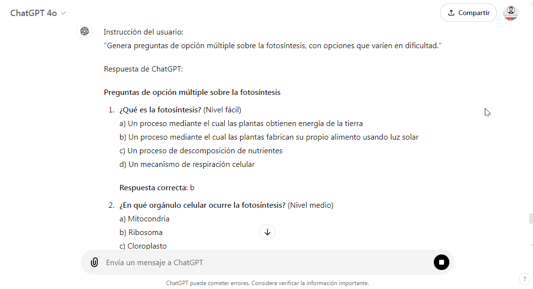 - Ejemplo (Biología): Para una clase de biología, ChatGPT puede generar preguntas de opción múltiple sobre la fotosíntesis, con opciones que varíen en dificultad.