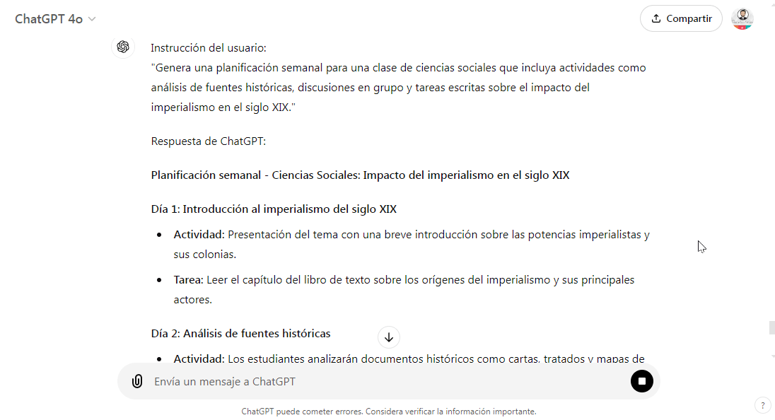 - Ejemplo (Ciencias Sociales): Para una planificación semanal en ciencias sociales, ChatGPT puede incluir actividades como análisis de fuentes históricas, discusiones en grupo y tareas escritas sobre temas como el impacto del imperialismo en el siglo XIX.