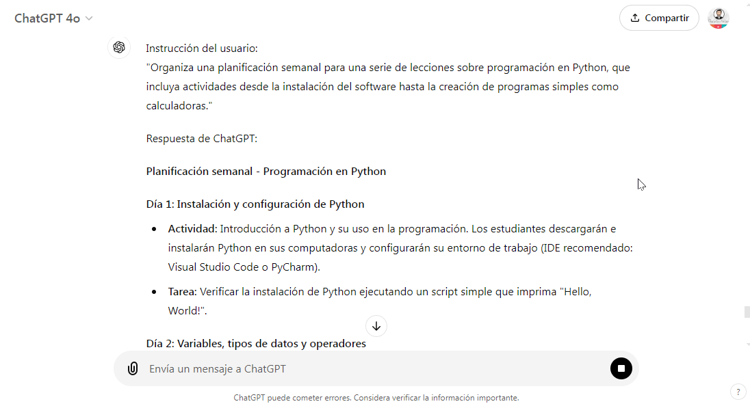 - Ejemplo (Informática): Para una planificación en informática, ChatGPT puede organizar una serie de lecciones sobre programación en Python, con actividades que vayan desde la instalación del software hasta la creación de programas simples como calculadoras.