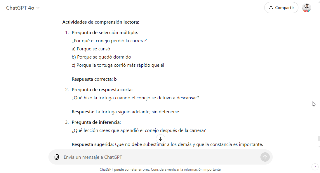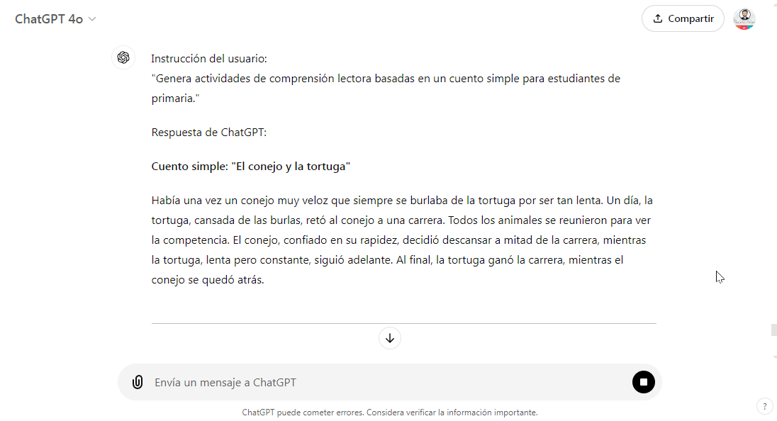 - Ejemplo (Lengua y Literatura): Un docente de primaria puede usar ChatGPT para generar actividades de comprensión lectora basadas en cuentos simples, mientras que en secundaria, puede generar análisis de textos literarios más complejos.