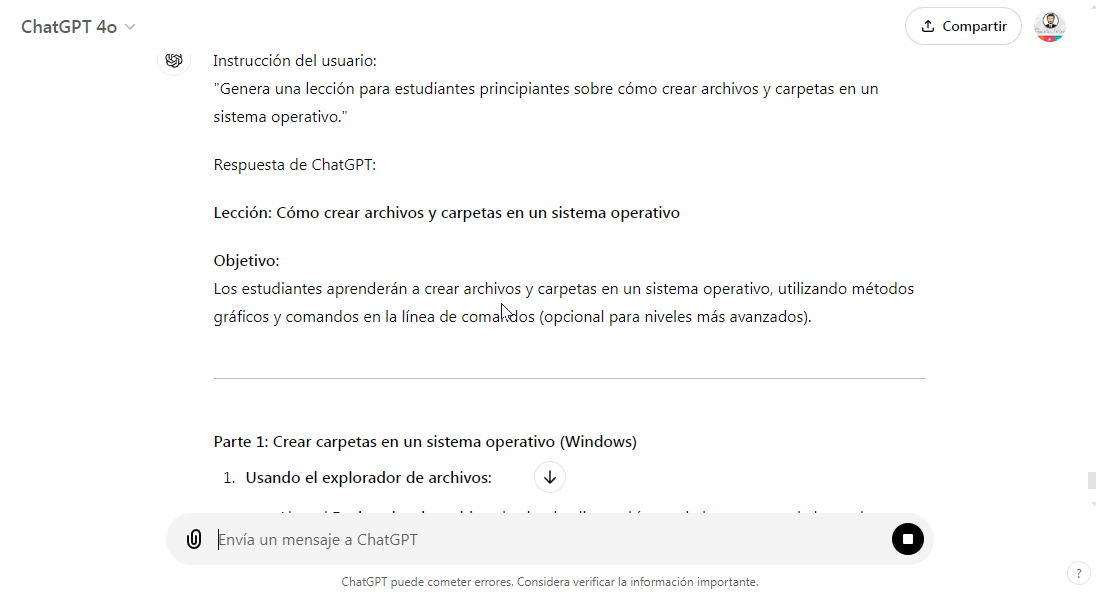 - Ejemplo (Informática): Para estudiantes principiantes, ChatGPT puede generar lecciones sobre cómo crear archivos y carpetas en un sistema operativo, mientras que para un nivel más avanzado, puede generar contenido sobre estructuras de datos en Python.