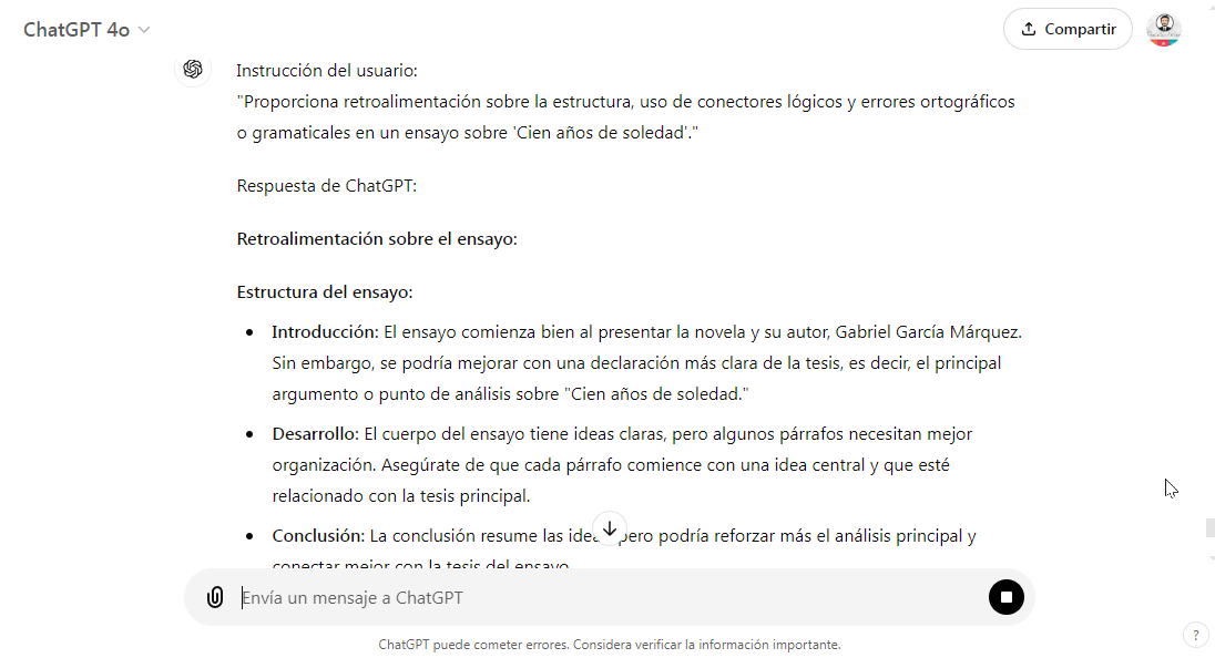 - Ejemplo (Lengua y Literatura): Los estudiantes pueden escribir ensayos sobre novelas como “Cien años de soledad”, y ChatGPT puede dar retroalimentación inmediata sobre la estructura del ensayo, el uso de conectores lógicos, y corregir posibles errores ortográficos o gramaticales.