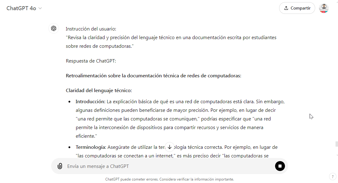 - Ejemplo (Informática): En un curso de informática, ChatGPT puede revisar documentación técnica escrita por los estudiantes sobre temas como redes de computadoras o algoritmos de programación, verificando la claridad y precisión del lenguaje técnico.