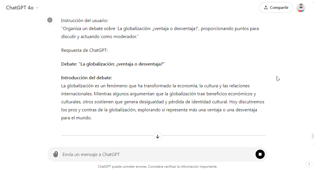 - Ejemplo (Ciencias Sociales): ChatGPT puede organizar un debate sobre temas como “La globalización: ¿ventaja o desventaja?”, donde los estudiantes debaten los pros y contras. ChatGPT actúa como moderador, proporcionando puntos para discutir y asegurando que cada estudiante tenga oportunidad de participar.