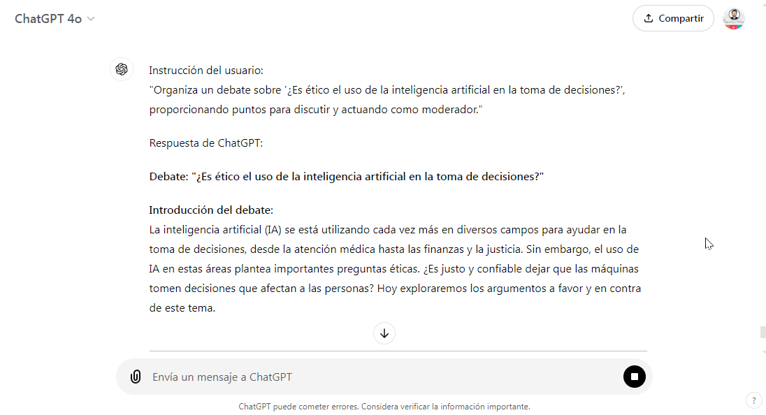 - Ejemplo (Informática): En una clase de informática, los estudiantes pueden debatir sobre temas como “¿Es ético el uso de la inteligencia artificial en la toma de decisiones?”, y ChatGPT puede moderar y sugerir argumentos a favor y en contra.