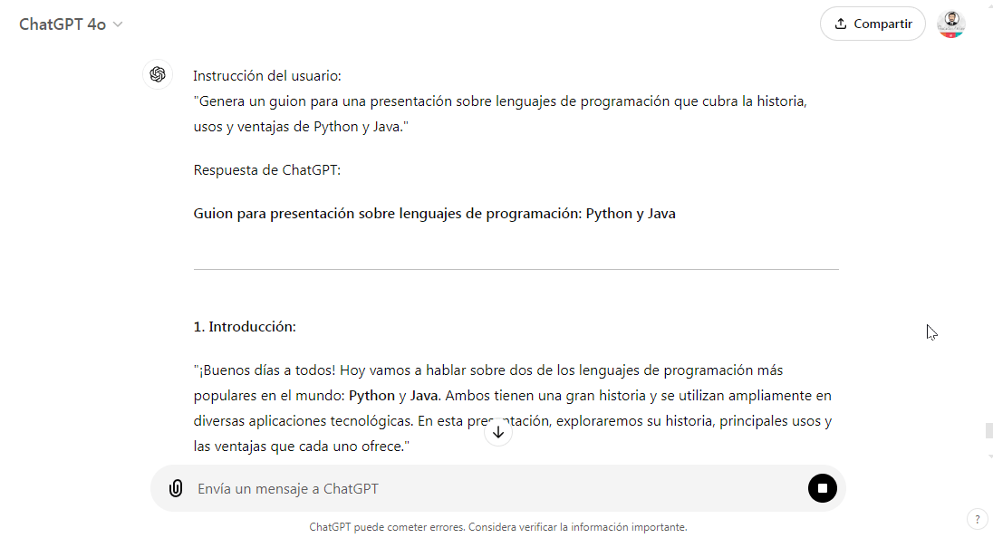 - Ejemplo (Informática): En una presentación sobre lenguajes de programación, ChatGPT puede ayudar a generar un guion que cubra la historia, usos y ventajas de lenguajes como Python o Java.