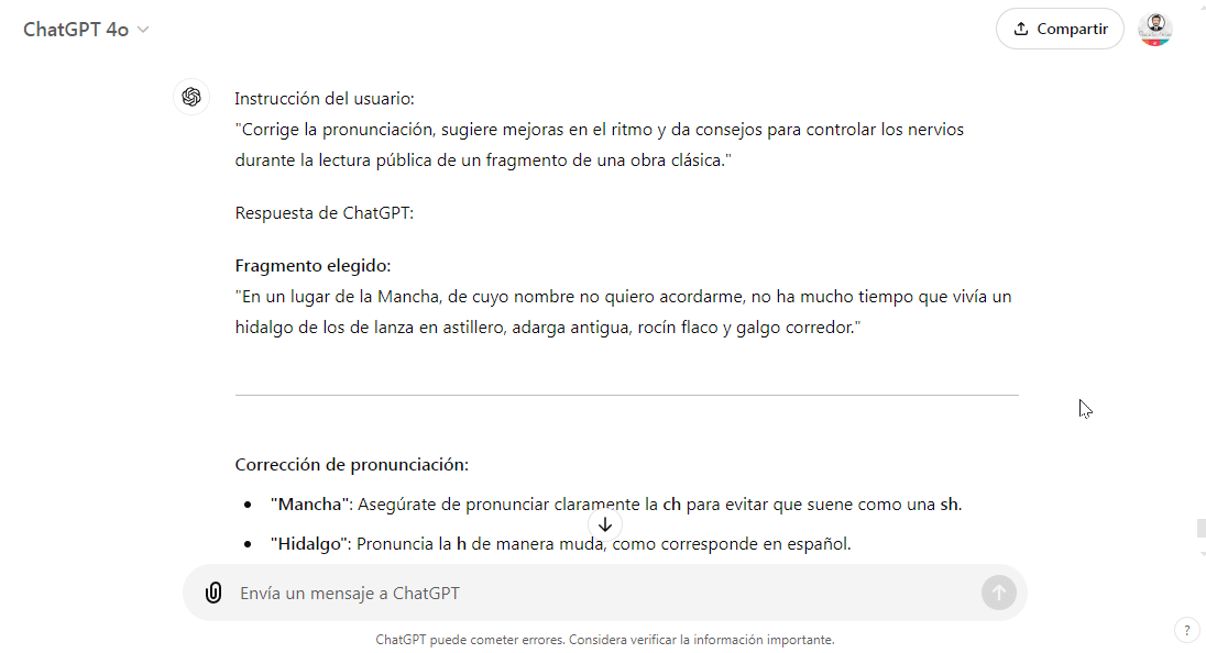 - Ejemplo (Lengua y Literatura): Para una clase de literatura, los estudiantes pueden practicar una lectura pública de fragmentos de obras clásicas, y ChatGPT puede corregir la pronunciación, sugerir mejoras en el ritmo y ayudar a controlar los nervios.