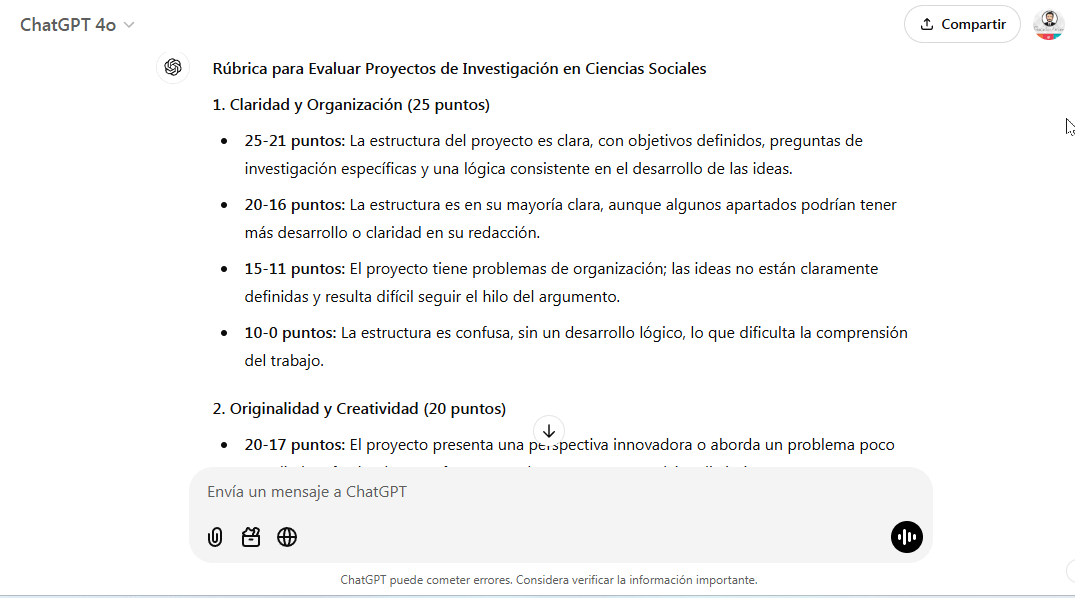 - Rúbricas automáticas: Los docentes pueden solicitar a ChatGPT que cree rúbricas detalladas para evaluar trabajos, proyectos y actividades en el aula.