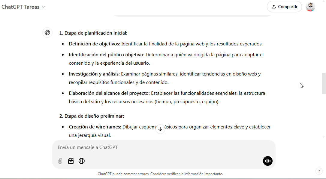 Ejemplo (Informática): Para un proyecto de desarrollo de una página web, ChatGPT puede estructurar las etapas desde la planificación inicial hasta el diseño final y la evaluación.