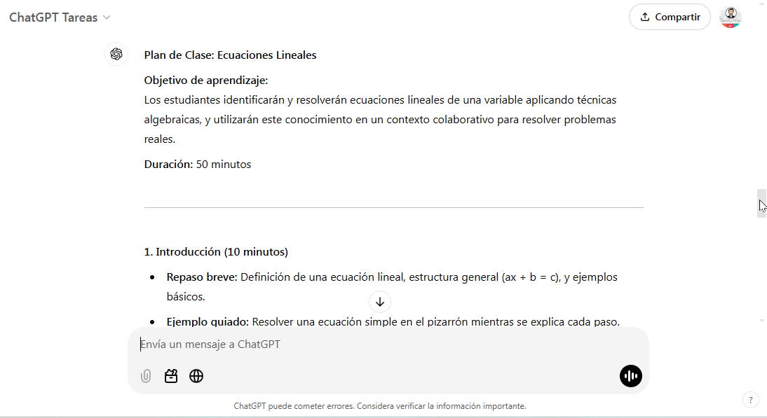 - Planes de clase rápidos: Los docentes pueden pedir a ChatGPT que genere un plan de clase completo para un tema específico, con objetivos, actividades y materiales sugeridos.