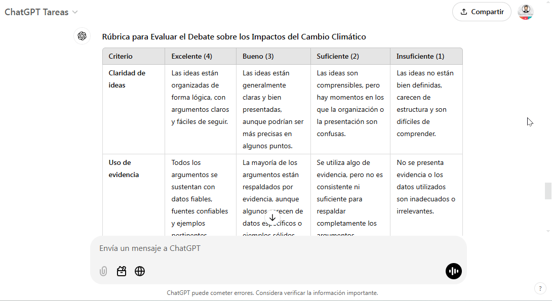 - Rúbricas personalizadas: Los docentes pueden solicitar a ChatGPT que diseñe rúbricas según los objetivos de aprendizaje y las competencias que desean evaluar. Ejemplo (Ciencias Sociales): “Crea una rúbrica para evaluar un debate sobre los impactos del cambio climático, incluyendo criterios como claridad de ideas, uso de evidencia y trabajo en equipo.”