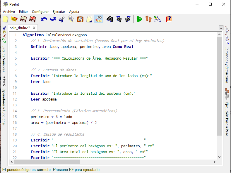 Orden de Operaciones: Fíjate en los paréntesis en la línea del área: (perimetro * apotema) / 2. Esto asegura que la multiplicación se realice antes de la división, manteniendo la jerarquía matemática.