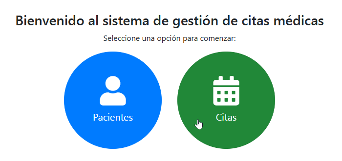 Página principal del sistema tras el inicio de sesión, con botones de acceso a pacientes y citas.