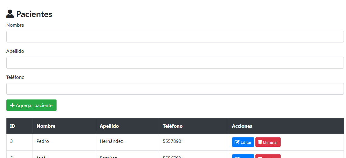 Permite agregar, ver, editar y eliminar información de los pacientes.